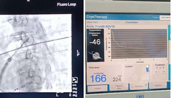 經(jīng)過詳細術前準備工作后,通過穿刺股靜脈,將導管沿靜脈進入右心房,經(jīng)房間隔穿刺后,將球囊分別放置在四個左心房-肺靜脈連接處,充盈球囊,使球囊完全封堵靶肺靜脈的血液回流,利用球囊尾端連接的制冷系統(tǒng),將球囊溫度迅速降低至40℃以下,使局部組織壞死,達到電隔離肺靜脈的目的。術中驗證四個肺靜脈電位均消失,房顫不能被誘發(fā),手術成功。
