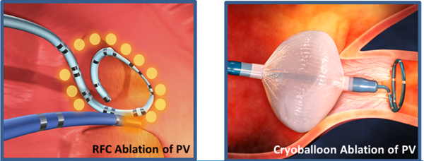 導管消融手術是房顫的根治性治療手段,目前在房顫介入治療領域,存在著一曲冰與火之歌——冷凍球囊消融技術與射頻消融技術。前者是通過電灼燒使靶點細胞變性壞死,后者則是通過冷凍劑蒸發(fā)吸取組織的大量熱量,快速降溫來實現(xiàn)消融。