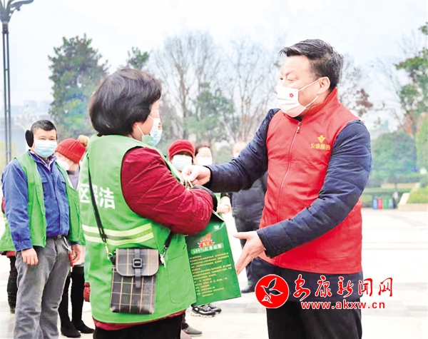 春節(jié)前,安康市慈善協(xié)會會長崔光華看望環(huán)衛(wèi)工人,并為其發(fā)放慰問品。 張蕾 攝